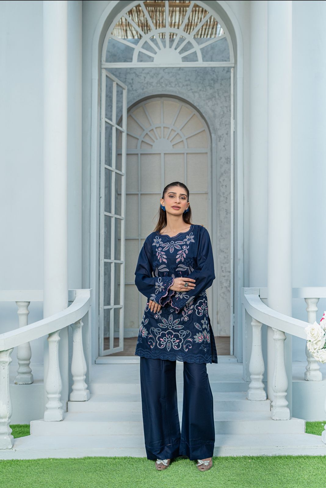 Discover AMYRL’s Navy Noir Embroidered 2-Piece Co-ord Set, made from premium cotton fabric for luxury comfort and modern womens wear. This designer embroidered outfit features elegant detailing, navy tones, and perfect tailoring — ideal for daily wear, office wear, formal occasions, and party wear.