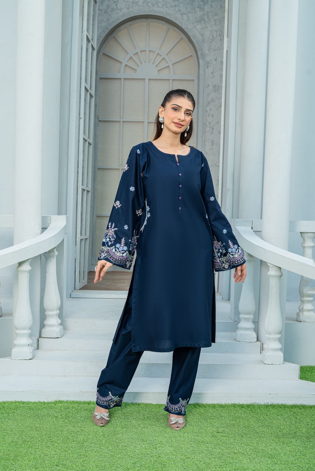 Dive into elegance with AMYRL’s Deep Sea Embroidered 2-Piece Co-ord Set, made from premium cotton fabric for luxury comfort and modern womens wear. This designer embroidered outfit features deep blue tones, fine detailing, and perfect tailoring — ideal for daily wear, office wear, formal occasions, or party wear.